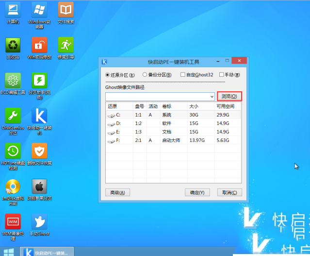 進入快啟動win8pe系統后,系統會自啟快啟動一鍵裝機工具,在工具界面點擊“瀏覽”按鈕,如下圖所示: