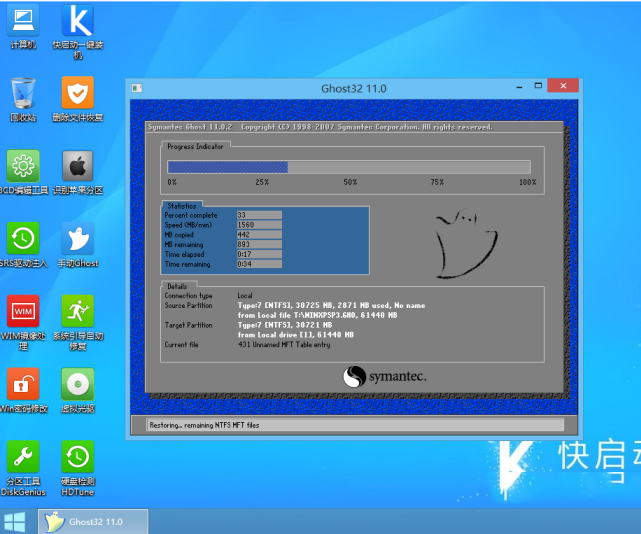 工具便會根據設置釋放系統鏡像到指定磁盤分區中,在此期間無須進行其他操作,等到安裝完成并重啟即可,如下圖所示: