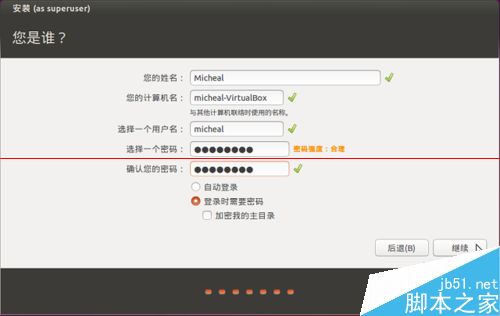 輸入完姓名,計(jì)算機(jī)名、用戶名會(huì)自動(dòng)生成;但是也可以修改啦。然后輸入密碼(輸入兩次,第二次輸入相同的進(jìn)行確認(rèn)),根據(jù)情況設(shè)置自動(dòng)登錄、加密主目錄等選項(xiàng)。