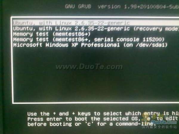 其它的就與硬盤安裝一樣一步步下去就可以了,安裝完后可以在 BIOS 中設置通過 USB 設備來啟動。這樣機器就會調用 U 盤上的 GRUB boot loader 了,由于我的硬盤上安裝的是 Win XP ,你可以從下圖中看到,之前在安裝 Ubuntu 的時候也把 Win XP 的啟動項自動識別出并加入到了 GRUB boot loader 中。