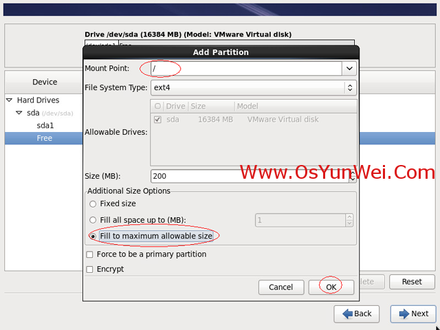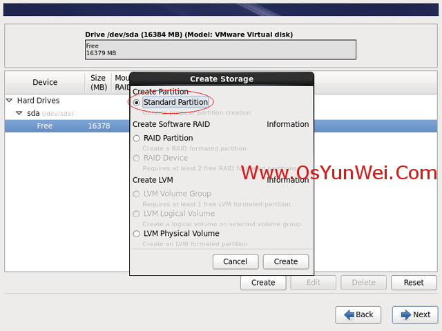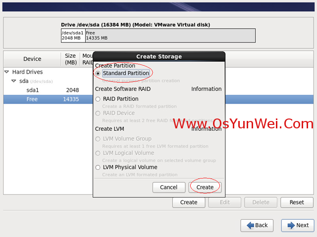 選中空閑分區Free,點創建Create,選擇標準分區Standard Partition,再點創建Create