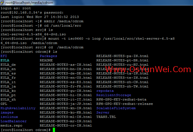 mount -t iso9660 -o loop /usr/local/src/rhel-server-6.5-x86_64-dvd.iso /media/cdrom #掛載系統鏡像