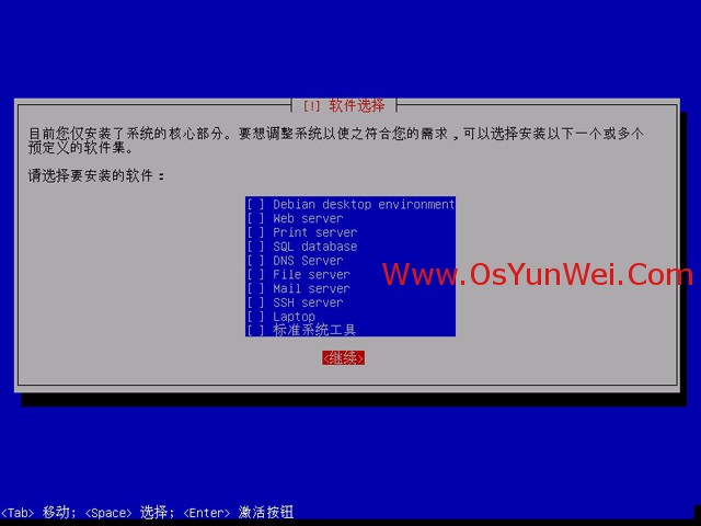 不選擇任何軟件包(服務器根據自己的需要再定制安裝軟件),點繼續。