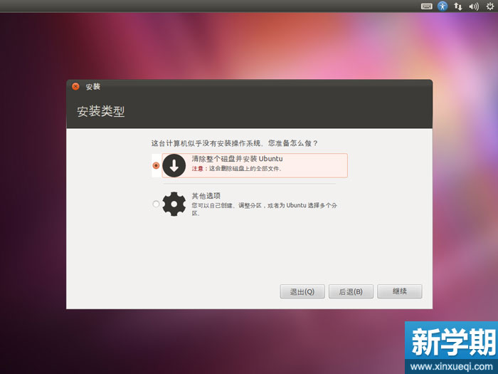 選擇“清空整個(gè)磁盤并安裝Ubuntu”,點(diǎn)擊“繼續(xù)”。