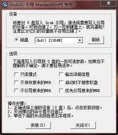 第五步:下面進入Grub2U引導寫入階段,必須注意的是,在磁盤選擇上千萬不能選成電腦的硬盤了,否則后果很嚴重的(但也不用過分擔心,因為理論上電腦硬盤一個分區往往比咱們的U盤容量大很多,從容量上很容易判斷出U盤的),以小編的2G容量的U盤為例,應該選擇容量為1925M的磁盤(U盤實際容量往往比標稱容量要小一些,很容易判斷的),選項中的可選參數最好保持為空,一個也不要勾選,默認即可,直接點擊“安裝”