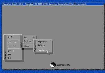 第十三步:點擊“開始”菜單,在程序中打開“諾頓Ghost V11”,啟動Ghost程序,接下來的操作步驟就跟平時用Ghost來安裝系統一樣了,操作順序為:點擊“Local(本地)—點擊“Partition(操作分類)”—點擊“From Image(來自鏡像文件)”
