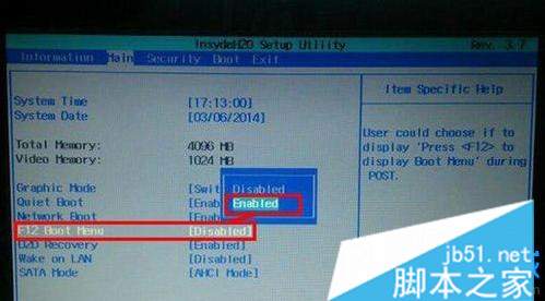 2、在【Main】下,按↓方向鍵選擇【F12 Boot Menu】按回車,設置為Enabled,回車確認;