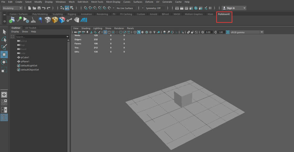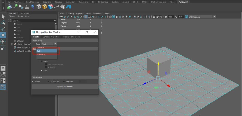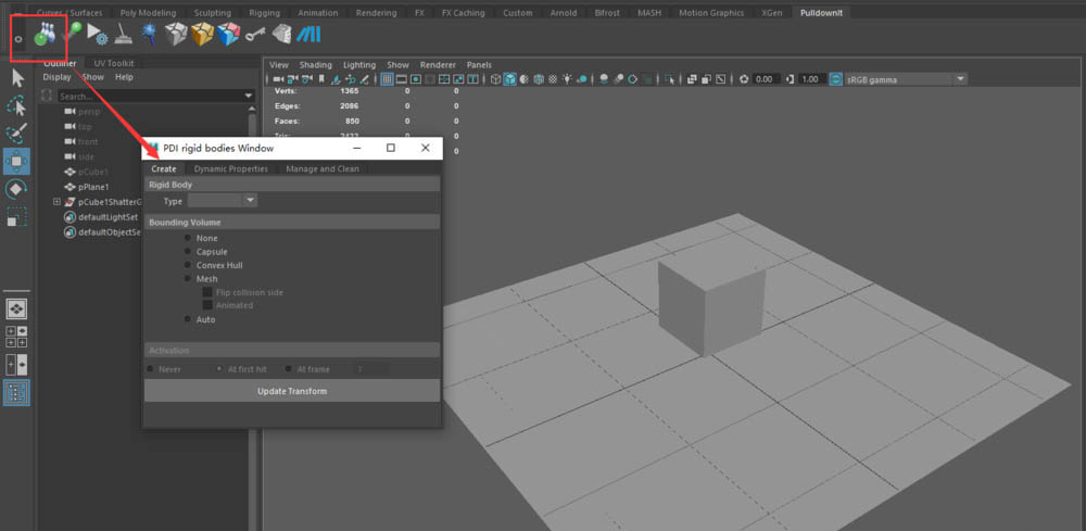 1、打開maya,新建一個四方體,和一個面片;點擊pulldownIT進入破碎插件界面