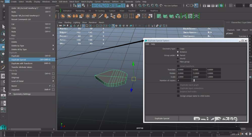 5、選中模型,執行edit---特殊復制duplicate special,點后面方框進入參數設置