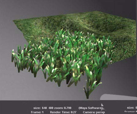 10、在Attribute Editor里還有一些其他的重要選項(xiàng)適用。“Seed”選項(xiàng)可以控制創(chuàng)建地形上草地的格式和位置。“Display quality”可以減少顯示在視圖中的草葉邊的數(shù)量,但是不會(huì)影響實(shí)際的密度。可以節(jié)約上傳到電腦的時(shí)間。下圖是地形密度設(shè)置為3.2的效果圖。