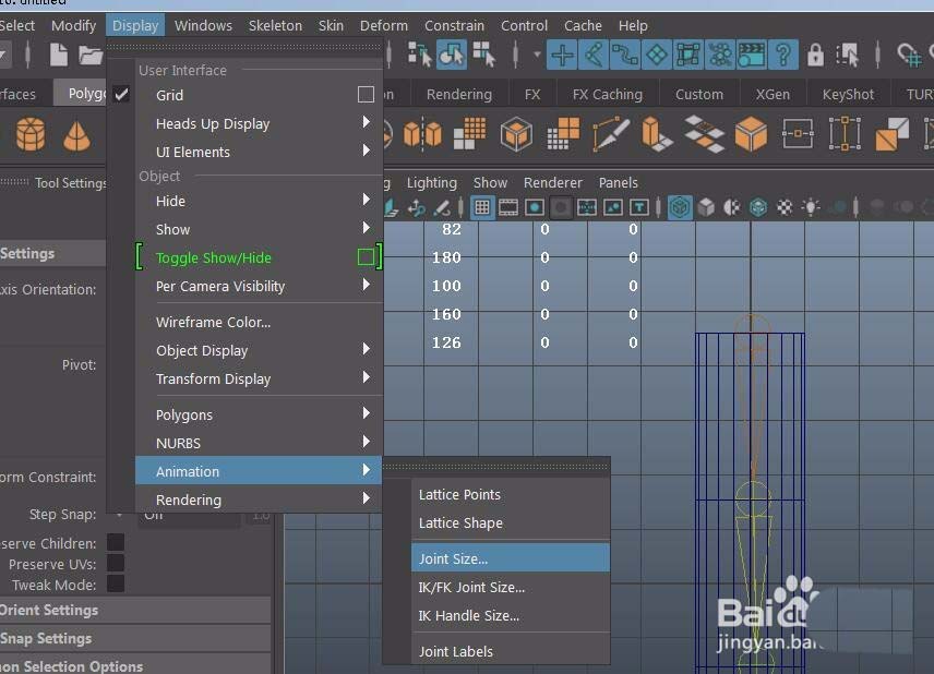 9、如果覺得骨骼太小可以調(diào)節(jié)顯示骨骼大小來調(diào)節(jié):display----animation---joint size