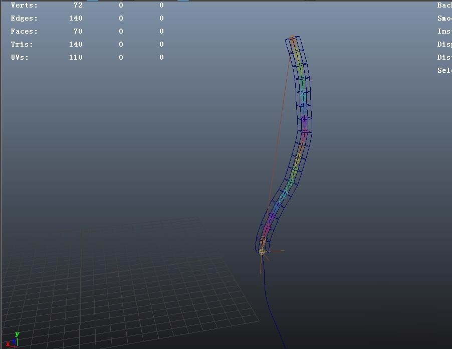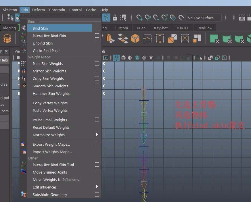 6、先選中主骨骼,再選物體,然后執行skip----》bind skip進行蒙皮,蒙皮后骨骼會變成彩色