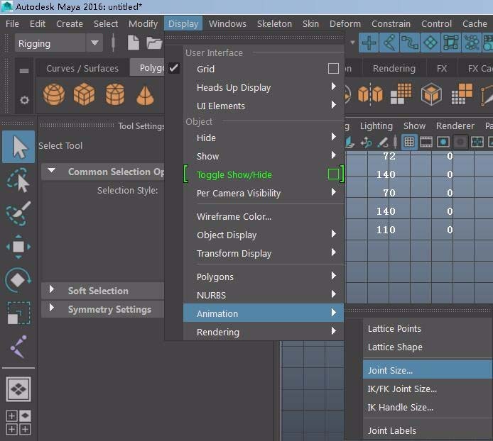 5、如果覺得骨骼太小,可以在display--->animation--->joint size調整骨骼大小
