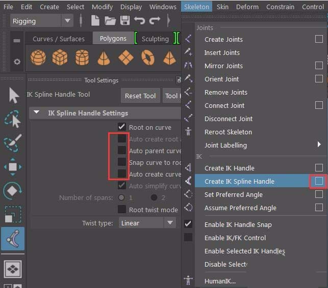 8、創建ik spline handle,點擊后面四方塊,取消下面的勾選