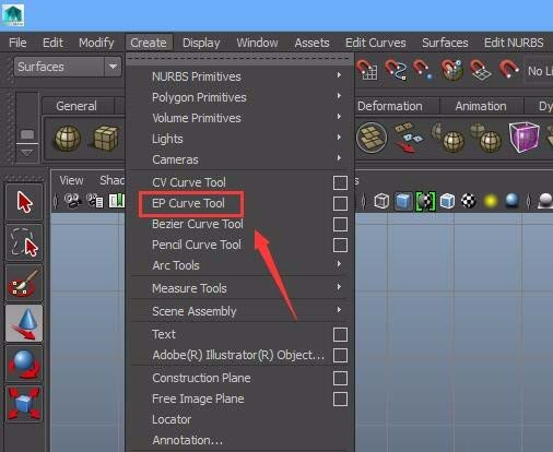 3、點(diǎn)擊create選項(xiàng),在其下拉菜單里找到EP curve tool選項(xiàng),如圖所示: