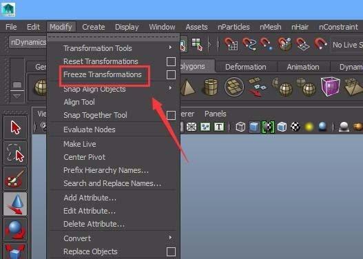 7、點擊modify菜單在其下拉菜單里找到freeze transformation選項,如圖所示: