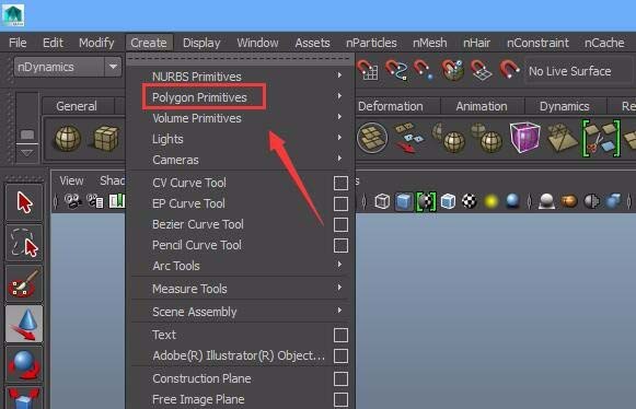 2、打開Maya之后我們在菜單里找到create選項,點擊該選項在其下拉菜單里找到polygon primitives選項,如圖所示: