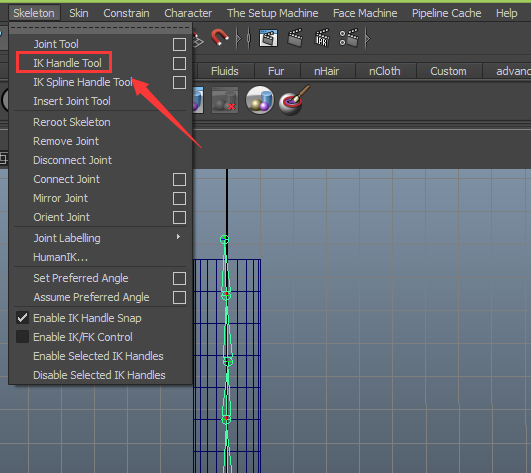 7、骨骼創建好以后,再在skeleton菜單里找到IK handle tool命令,為骨骼創建IK控制,如圖所示: