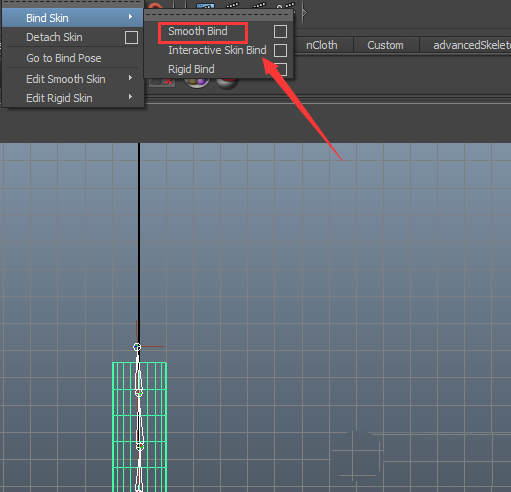 11、點擊bind skin選項,在其下拉菜單里找到smooth bind選項,如圖所示: