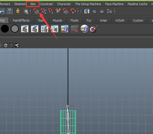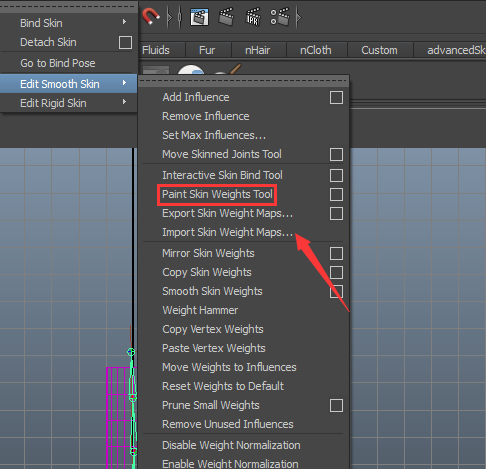 14、點擊edit smooth skin選項,在其下拉菜單里找到paint skin weights tool選項,選擇該選項后為每節骨骼調節權重值,如圖所示: