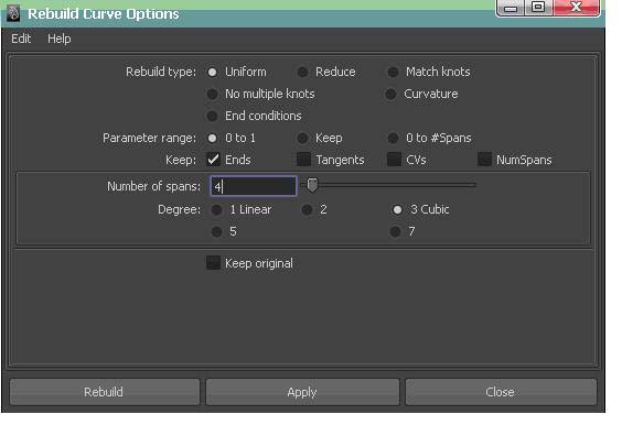 3、用畫筆工具創建出的曲線CV點,EP點相對繁多,可以執行Edit Curve—Smooth Curve(平滑曲線)來光滑曲線,精簡曲線上的CV點,也可以使用Edit Curve—Rebuild Curve(重建曲線)進行參數設置重建曲線。