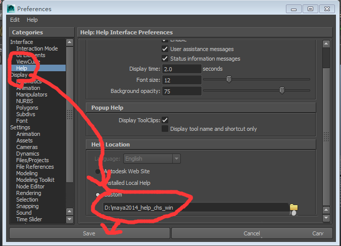 2、點擊Help選擇Custom,選擇中文幫助文件夾點擊Save