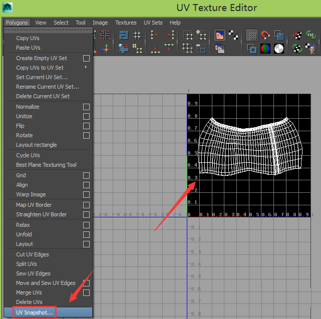 6、在視圖里選擇人物的裙子,在uv texture editor對話框內就出現了裙子的UV坐標信息了,在polygons菜單里找到uv snapshot選項,如圖所示: