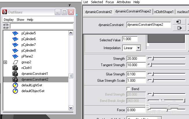 10、播放動畫看下效果。現在編輯可撕裂的表面,打開outliner并選擇dynamicConstraint2。然后打開屬性編輯器。