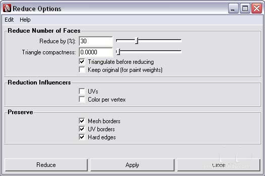 3)選擇你的新分離的多邊形平面,并點擊 mesh>reduce。將其減少到30%,在減少之前檢查三角化,確保檢查所有的保存。