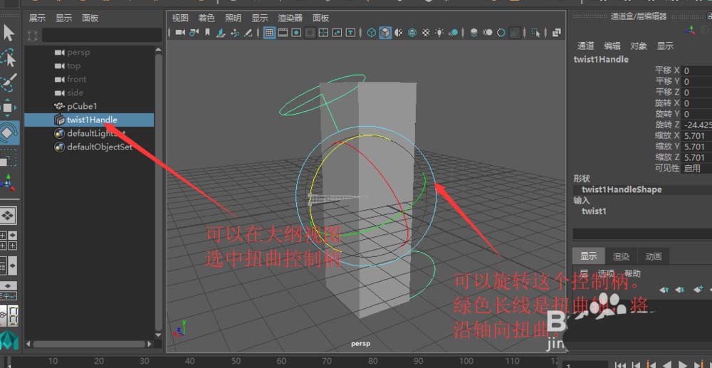 3、我們在大綱視圖可以看到名為twist1Handle1的控制柄對象。我們可以使用移動/旋轉/縮放工具來移動控制柄的位置。控制柄由兩個環,是扭曲的起止平面,還有一根長線,是扭曲的軸向。