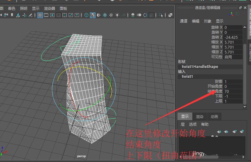 5、同樣的,我們也可以屬性編輯器中修改該變形器的開始結束角度,和上下限。我們看到,改動上下線可以移動圓環的位置,也就是被扭曲的范圍。
