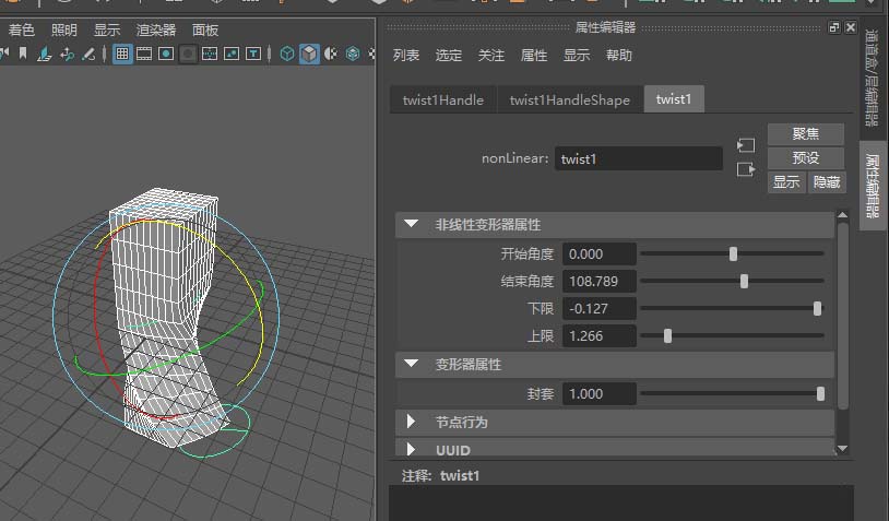 2、選中該物體,找到菜單 變形->非線性->扭曲,創建一個扭曲控制柄