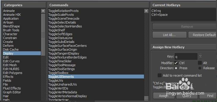 在hotkey sditor窗口里,在categories中選擇display。在右邊的commands中選擇toggleUIElments。然后再右邊assign new hotkey下面設置自己需要的快捷鍵,用query按鈕檢測設置的快捷鍵是否有被利用到,沒有被利用的話點擊assign就可以。