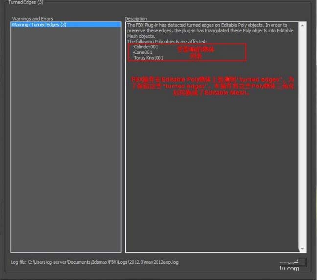 6、按照第2步和第3步的操作再次導出,出現如下圖的錯誤提示,可以看到,有三個物體被FBX插件強制轉換成了三角面。