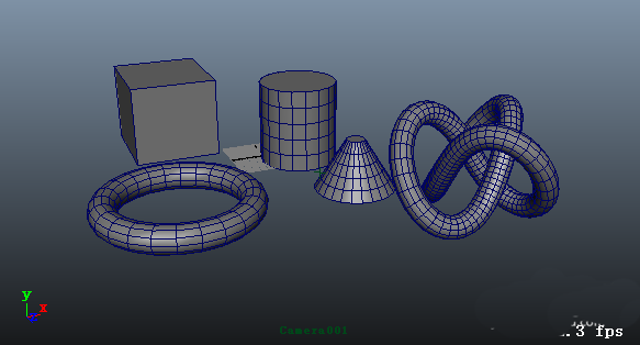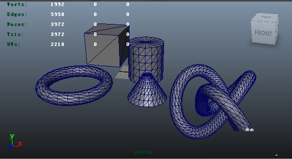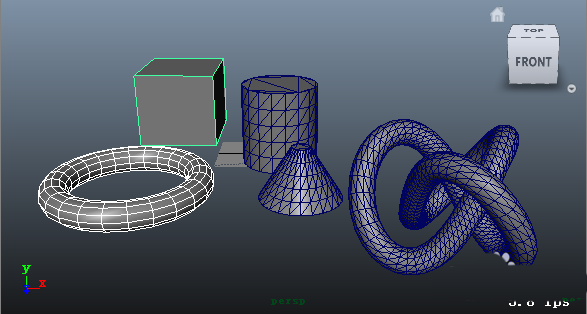 7、導入到Maya,可以看到有三個模型確實是被轉換成了三角面,另外兩個保持了四邊面見下圖。