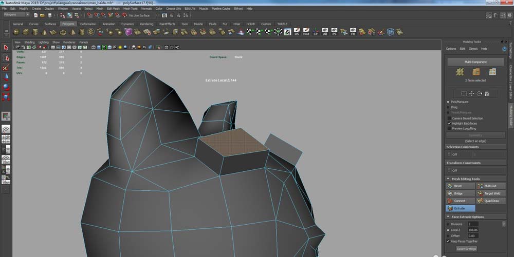 5、說一下貓耳朵的制作,Modeling Toolkit找個工具里本身提供了Extrude的功能。選擇好要進行擠壓的面,點擊Extrude按鈕,把鼠標移動到選中的面上,按住滾輪鍵,拖動鼠標可以控制擠壓的大小。擠壓出一個耳朵的高度。高度也可以調整,所以不需要太糾結。大概的就可以了。