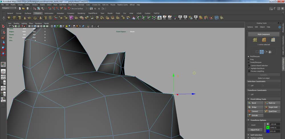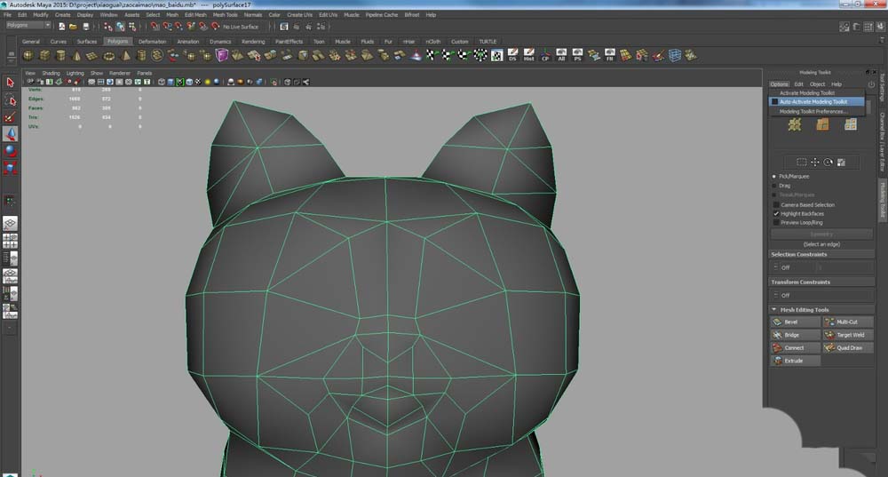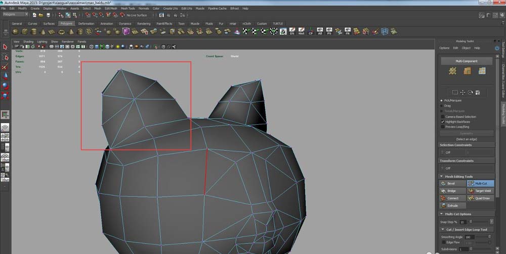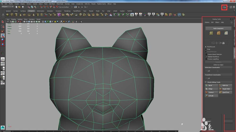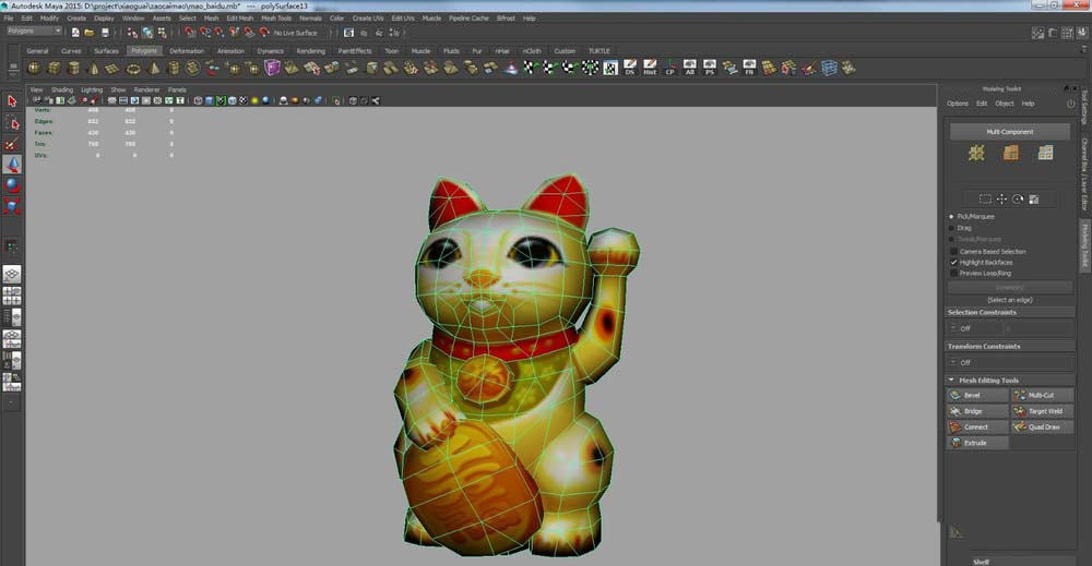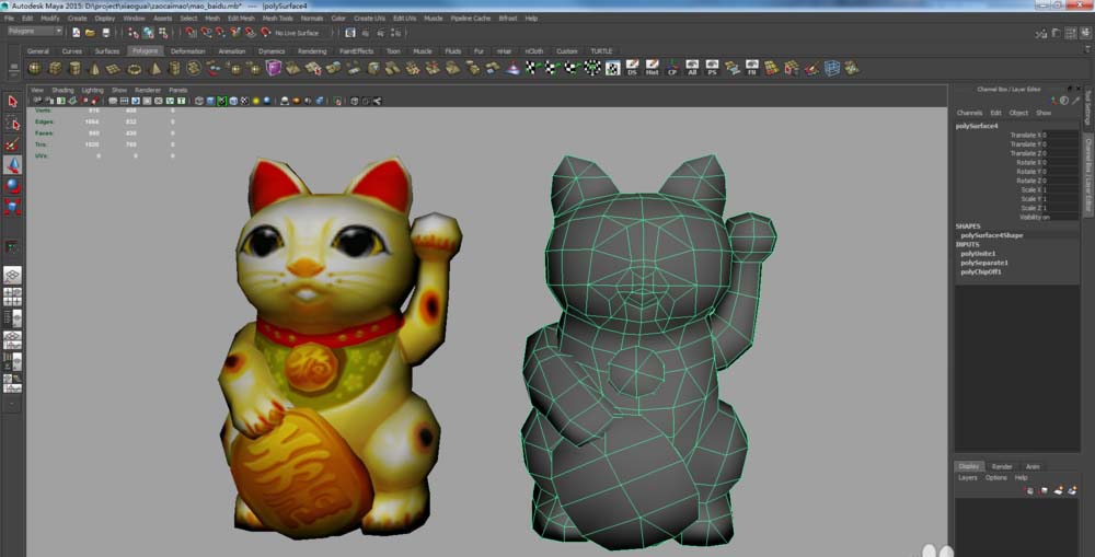 這里用一個簡單的招財貓模型來舉例。這個模型面數并不多,使用了也都是簡單的Maya命令就可以做出。主要就使用了Extrude、Multi-Cut命令,非常簡單的制作方法,但是可以變換無窮。