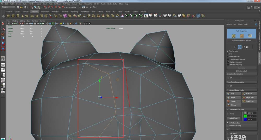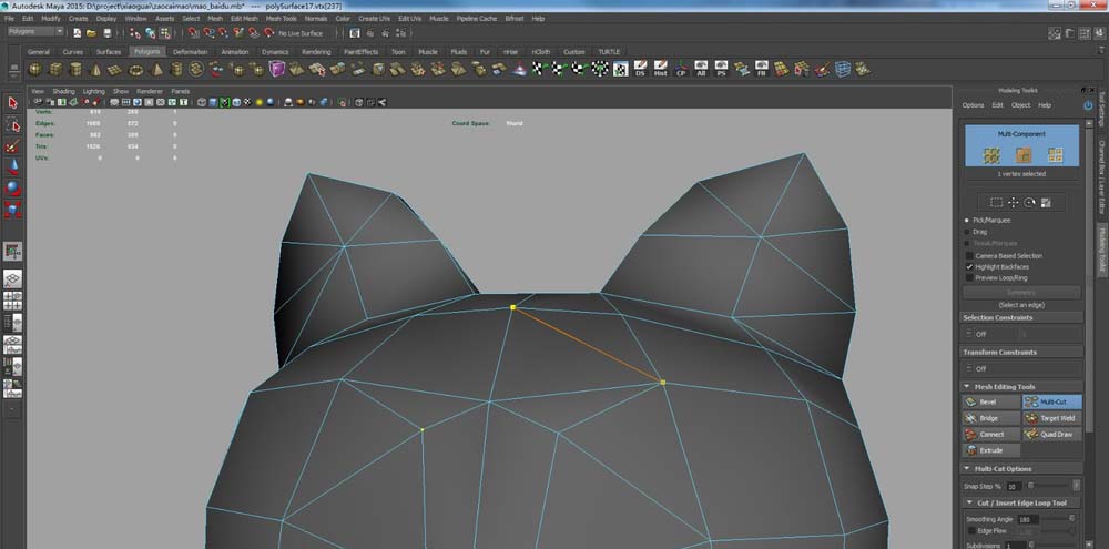 6、來是切線,Modeling Toolkit提供了一個方便的切線功能Multi-Cut,這個功能可以環形切線的,點擊Multi-Cut同時按住Ctrl鍵。移動鼠標就可以看到一條虛線,虛線就是標記切的位置,點擊鼠標左鍵,確認切割,就看到切出了一條環形的切割線。調整點、線、面。調成耳朵的形狀就完成了!