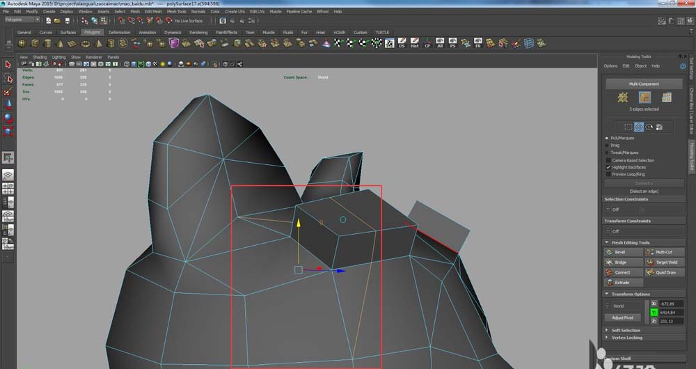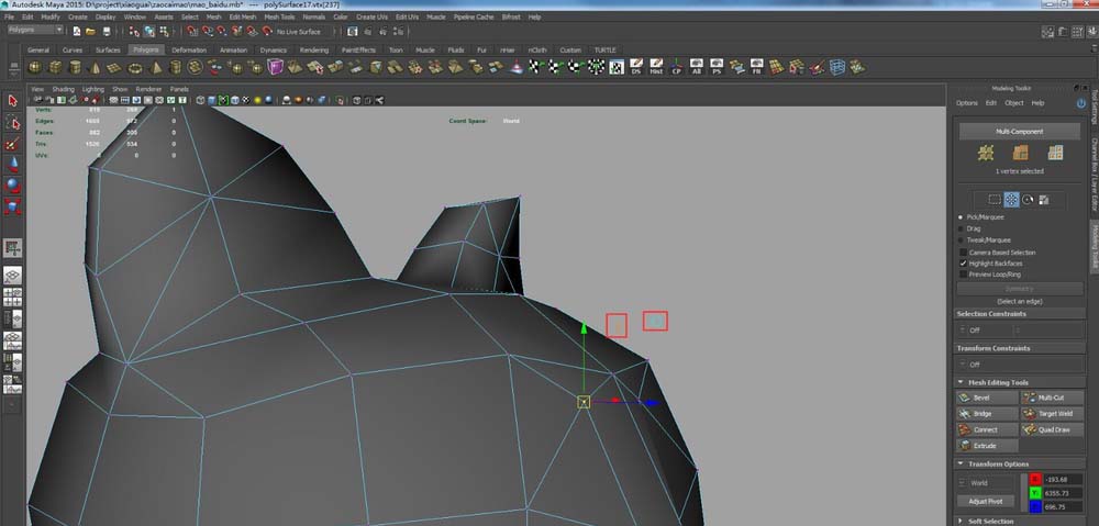 4、里招財貓的鼻子部分就是用切割線的方式制作出來的。先切割好線,然后按“W”用移動工具調整出來一個鼻子的形狀。