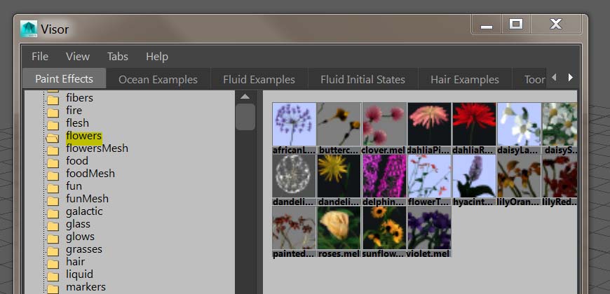 2、恭喜,Visor 窗口已經打開了,這就是 Paint Effects 的窗口!點擊一個你需要的樣式,開始繪畫吧。
