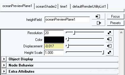 5、當預覽平面被選中時,按Ctrl + A打開屬性編輯器,出現屬性編輯器,點擊“ Ocean Preview Plane1”選項卡,您將會遇到幾個選項,如Resolution,Color,Displacement等。分辨率增加預覽平面的分段,這將導致場景中更平滑的結果。然而,分辨率的提高可能會降低播放速度和系統性能,換句話說,渲染將從系統中占用更多的內存,預覽播放速度會比平時慢。顏色和位移被鎖定,你不需要玩這些,所以只要把它們保持默認值。高度刻度增加預覽平面的高度位移。