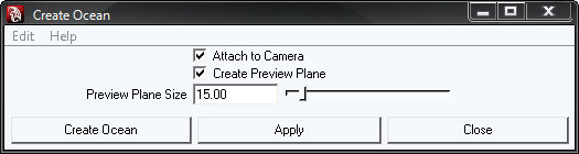 3、將打開屬性窗口,選中“ Attach to Camera”并創建“Create Preview Plane”框。預覽平面尺寸是在播放屬性時顯示海洋對場景的影響的預覽平面,您可以給予任何您喜歡的值。在這里,給它一個值15,想檢查海洋的運動流程,你可以播放動畫。