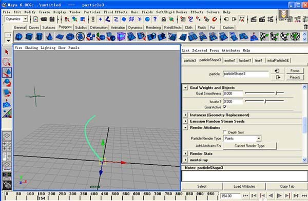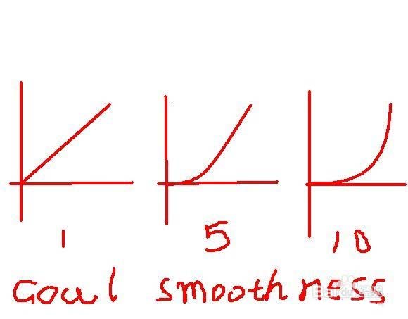 6、我們打開GOAL WEIGHTS AND OBECT的箭頭,下面有三個參數,GOAL SMOOTHNESS是調節粒子權重的平滑度,我們來做個小實驗。選擇LOCATOR,按S在不同幀做位移動畫,發現粒子到LOCATOR一直是象一條直線一樣,毫無變化,我們調高GOAL SMOOTHNESS的值到8,粒子到LOCATOR的路徑變成了一條曲線,很平滑。不同值GOAL WEIGHT曲線大概如下