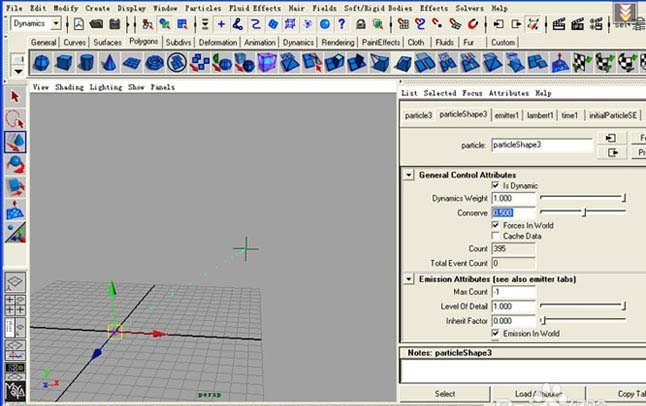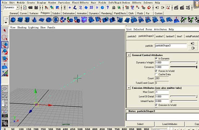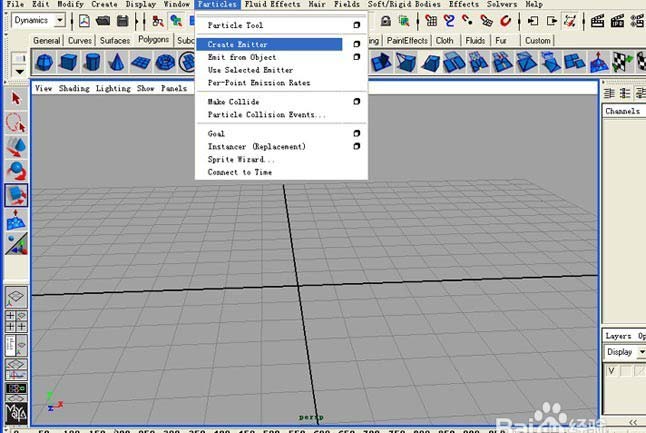1、首先啟動MAYA,按F4進入動力學模塊,在PARTICLE菜單下新建粒子發射器,如圖。