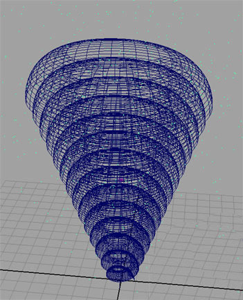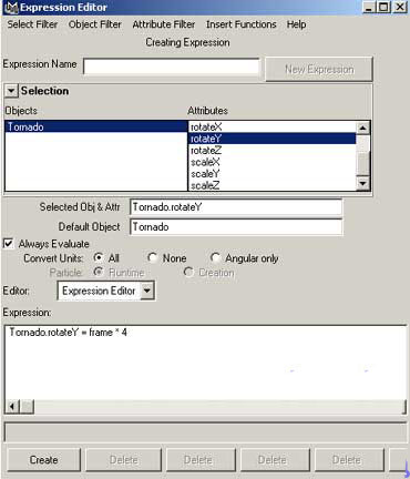 選中 Tornado, 在 Channel Box 中的 Rotate Y 屬性上點右鍵 , 并在菜單中選擇 Expressions. 在 Expression Editor 的 Expression area 輸入 "Tornado.rotateY = frame * # " 你可以自行確定 # 的數值 , 數值越大龍卷風的自旋就越快