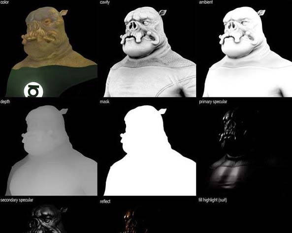 我合并了反射貼圖和凹凸貼圖,還有cavity貼圖,來生成我的貼圖的主要部分。因為我的目的是想生成一個靜幀圖片,我在Photoshop中依據(jù)我的主要渲染攝像機,繪制了我的貼圖,然后用camera projection 技術(shù)導(dǎo)回了我的模型上