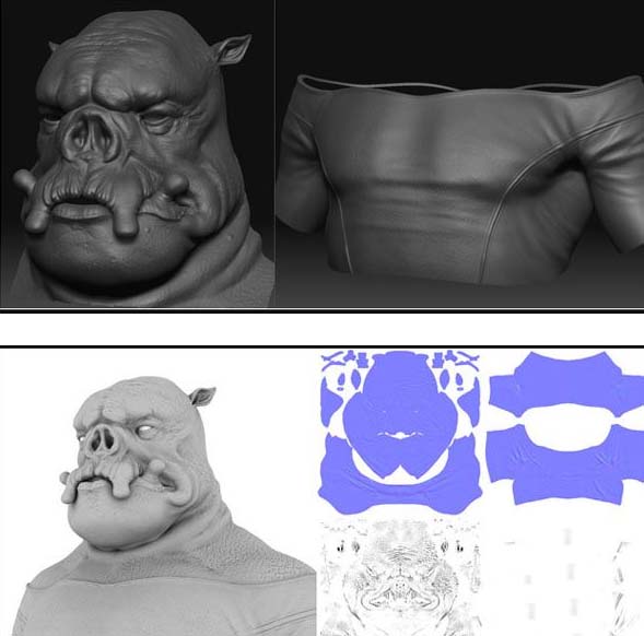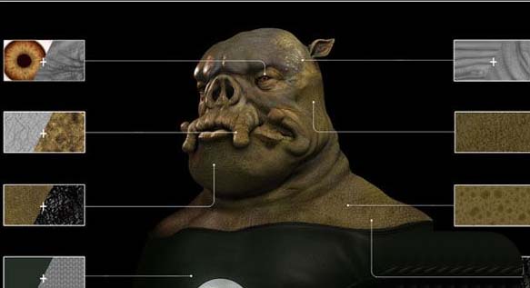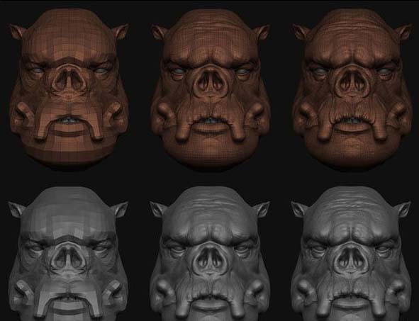 1、我開始時用Subtool 和basic sculpting tools來塑造外形和制作細節(jié)。覺得滿意之后,將保留有大體棱廓還不會嚴重影響渲染時間的細分網(wǎng)格導(dǎo)入到Maya。剩下來的細節(jié)就是用ZBrush導(dǎo)出的normal 和cavity圖來完成的。