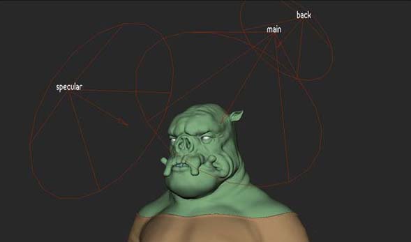 這個場景中的照明分為主光源,反射光源和一個背光。主光源用來投射主要的陰影,反射光是一個低強度的橘紅色光
