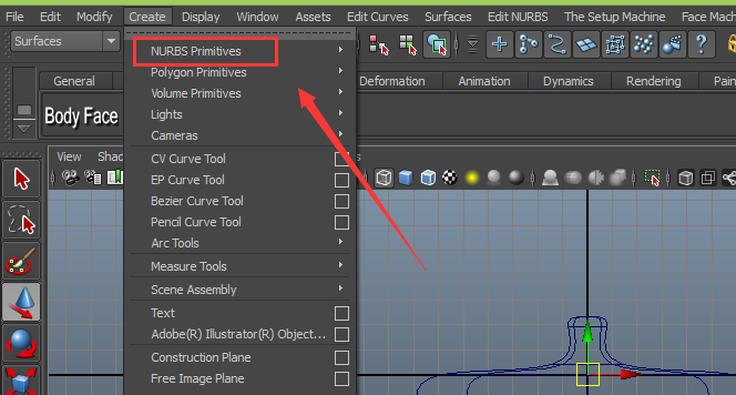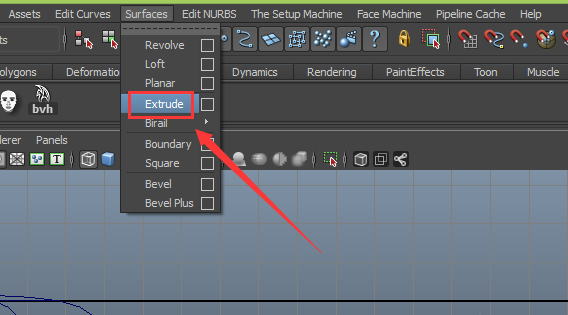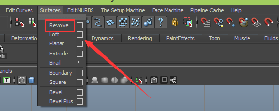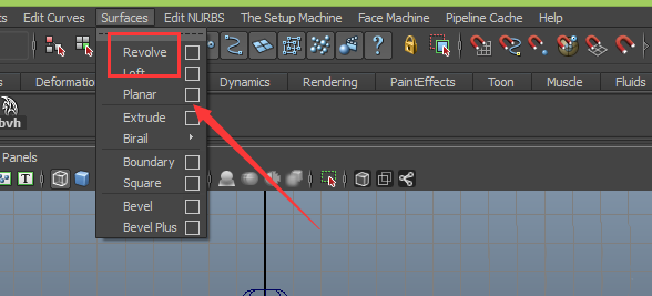 5、選擇調節好的曲線,在菜單區里找到surfaces菜單,點擊surfaces菜單在其子級菜單里找到revolve命令,如圖所示: