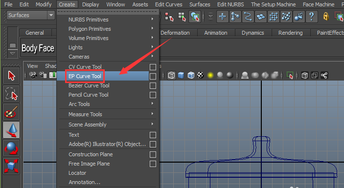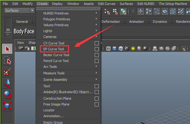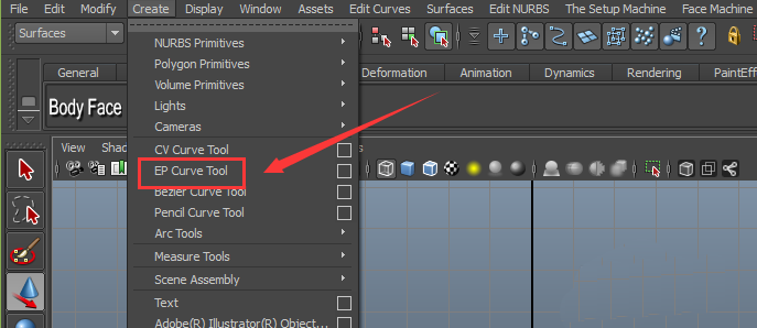 2、在該界面內找到create選項,點擊create選項,在其子級菜單里找到EP curve tool命令,如圖所示: